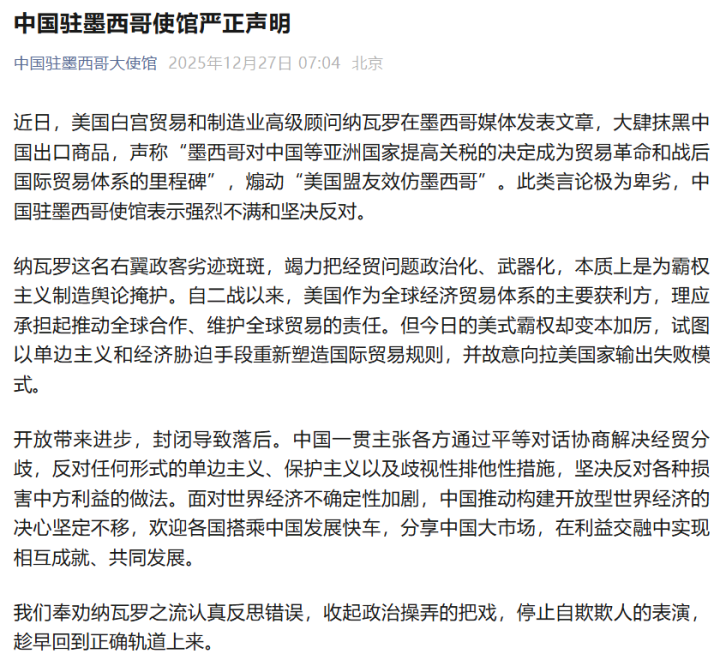 据中国驻墨西哥大使馆微信公众号音书,12月27日,中国驻墨西哥使馆发布严正声明: